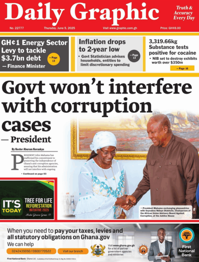 Thursday June 5 2025 Newspaper Headlines Newspaper Headlines June 5, 2025 7:25 am - Audio By Carbonatix FacebookWhatsAppTwitterTelegramEmailPinterestPrint Previous articleMahama to set up inter-ministerial committee to implement economic dialogue recommendationsNext articleNDC to rename headquarters after Rawlings [Photos] TagsNewspaper headlines RELATED ARTICLES Local News Asantehene demands enforcement of law recognising Naba Azoka II as Bawku Chief Local News Government to issue position on Bawku peace mediation report within 24 hours Local News Bryan Acheampong says Bawumia is his biggest competitor in NPP race