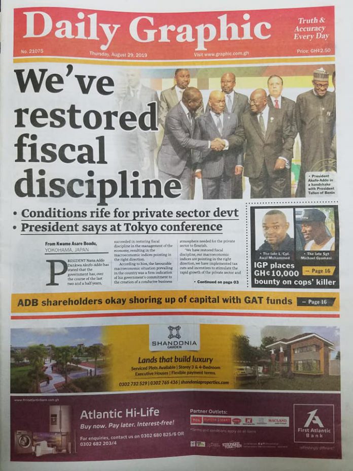 Today’s Newspaper Headlines Newspaper Headlines August 29, 2019 10:04 am - Audio By Carbonatix FacebookWhatsAppTwitterTelegramEmailPinterestPrint Previous articleIGP places GH¢10,000 bounty on cops’ killerNext articleFamily of slain policeman wants body for burial RELATED ARTICLES Newspaper Headlines Newspaper headlines: Monday, November 24, 2025 Newspaper Headlines Newspaper headlines: Friday, November 21, 2025 Newspaper Headlines Newspaper headlines: Thursday, November 20, 2025