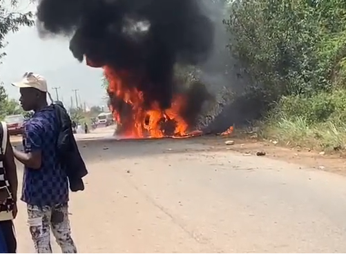 A Toyota Voxy has been burnt to ashes after it caught fire following an accident at Asikyire Nkwanta in the Bibiani-Anhwiaso-Bekwai Municipality of the Western North Region.