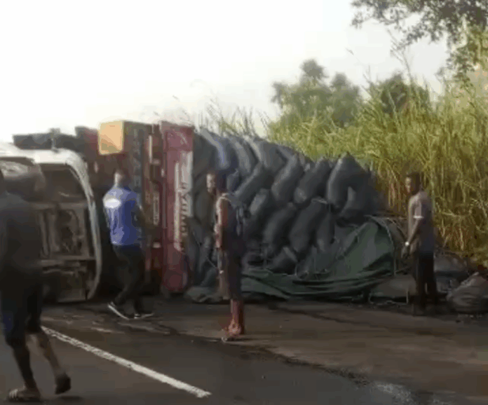 Two trucks overturned near the Kibi Junction stretch of the Accra–Kumasi highway early this morning following a collision that left the busy corridor heavily congested for hours.