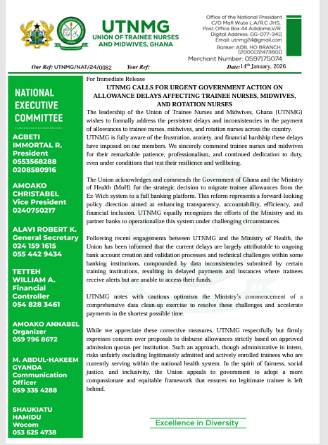 The Union of Trainee Nurses and Midwives, Ghana (UTNMG), has called on the government to take urgent action to address persistent delays in the payment of allowances to trainee nurses, midwives, and rotation nurses across the country.