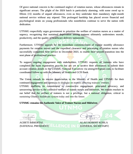UTNMG reaffirmed its commitment to constructive engagement with stakeholders, stressing that the welfare of trainee nurses and midwives is a national responsibility critical to sustaining Ghana’s healthcare system.