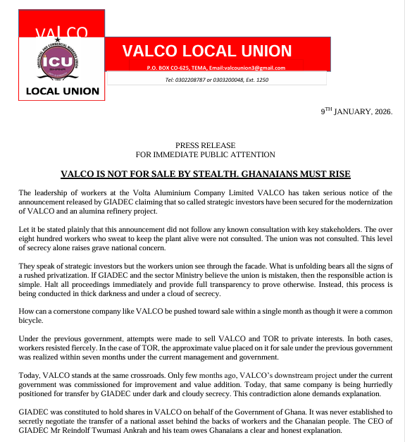 In a press release dated January 9, 2026, the VALCO Local Union criticised an announcement by the Ghana Integrated Aluminium Development Corporation (GIADEC) claiming that strategic investors had been secured to modernise VALCO and establish an alumina refinery.