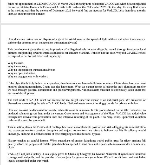 Workers questioned how a national asset like VALCO could be positioned for transfer without transparent valuation, stakeholder engagement, or the involvement of an independent transaction advisor. They also expressed concern over reports that parts of VALCO’s land could be targeted under the guise of an industrial park project.