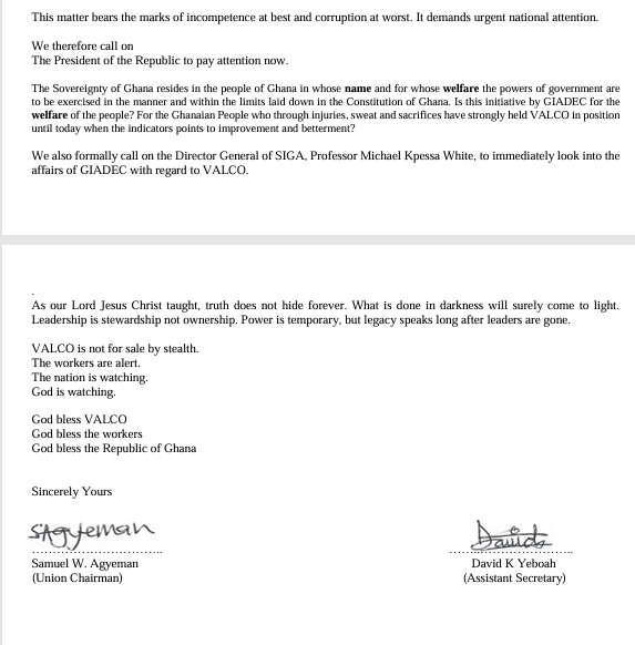 The union called on President John Dramani Mahama to intervene, stating that they believe he would not knowingly support any process that undermines transparency or the interests of workers. They also urged the Director-General of the State Interests and Governance Authority (SIGA), Professor Michael Kpessa-Whyte, to immediately investigate GIADEC’s handling of VALCO.